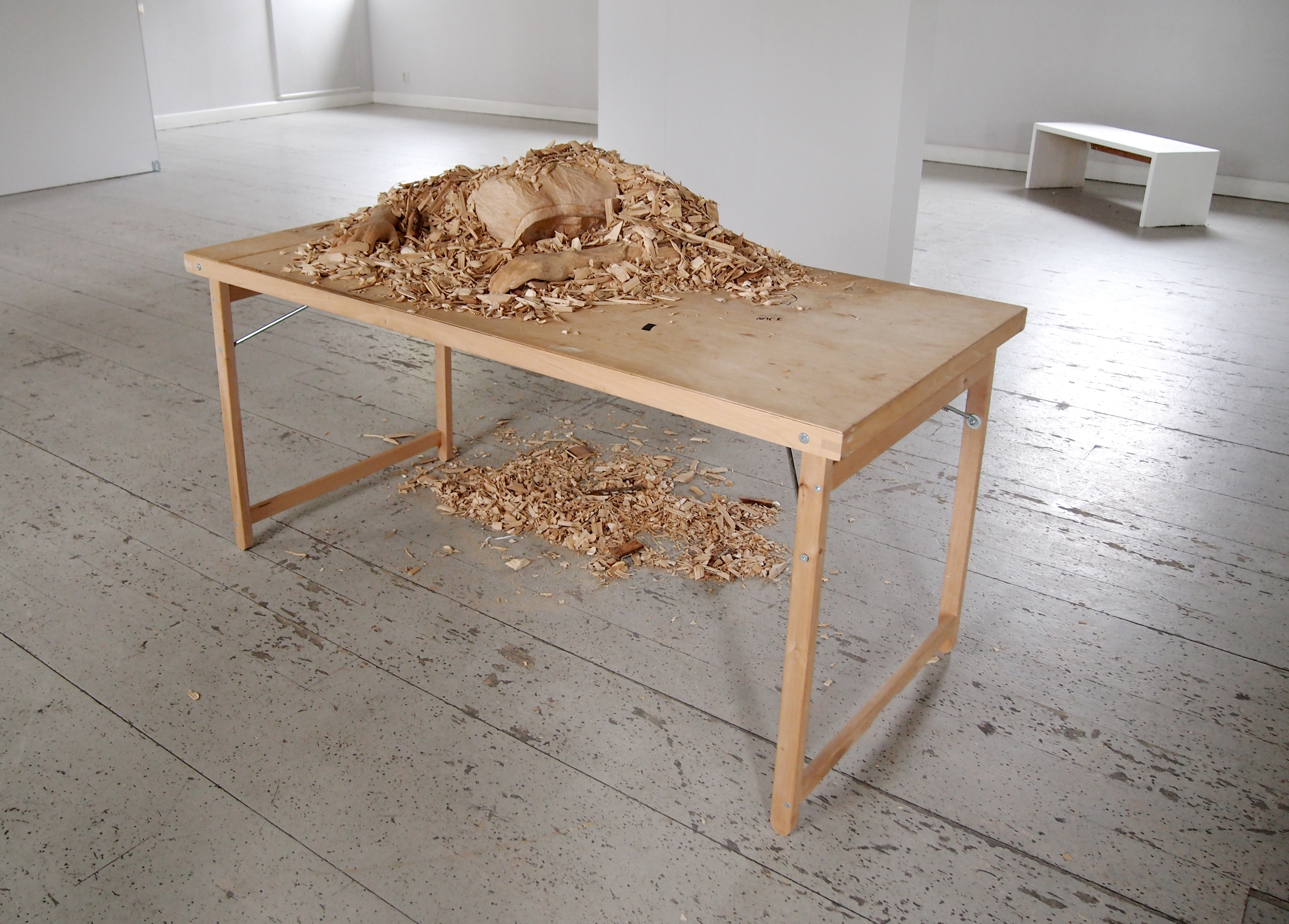 Woodcarved linden placed on 2nd hand wooden desk. Title is taken from the the scribbled words and lists on the desktop. Work is performed between 8am -5pm spring 2015 (Mon-Fri) spring 2015.