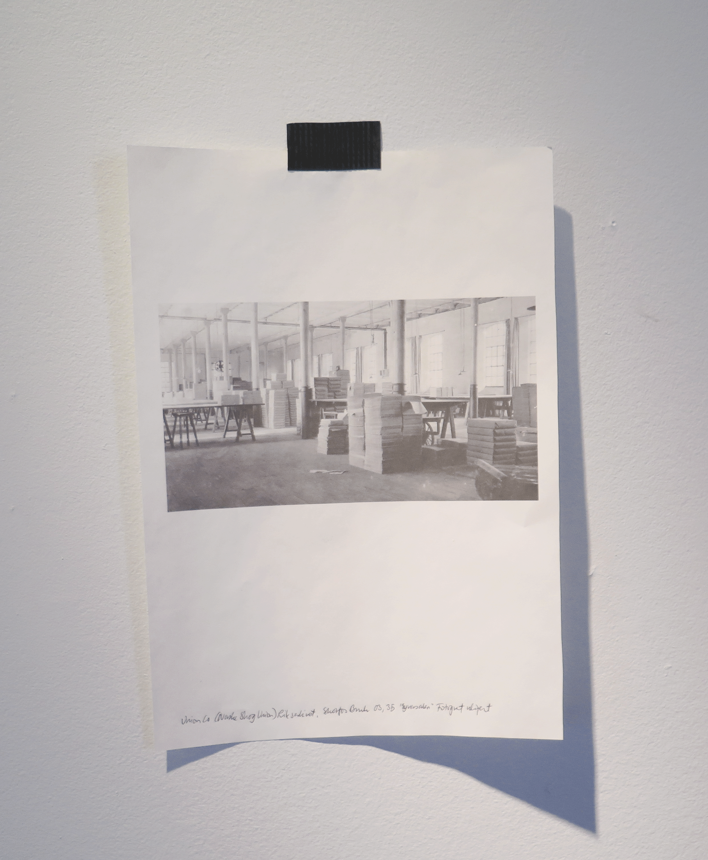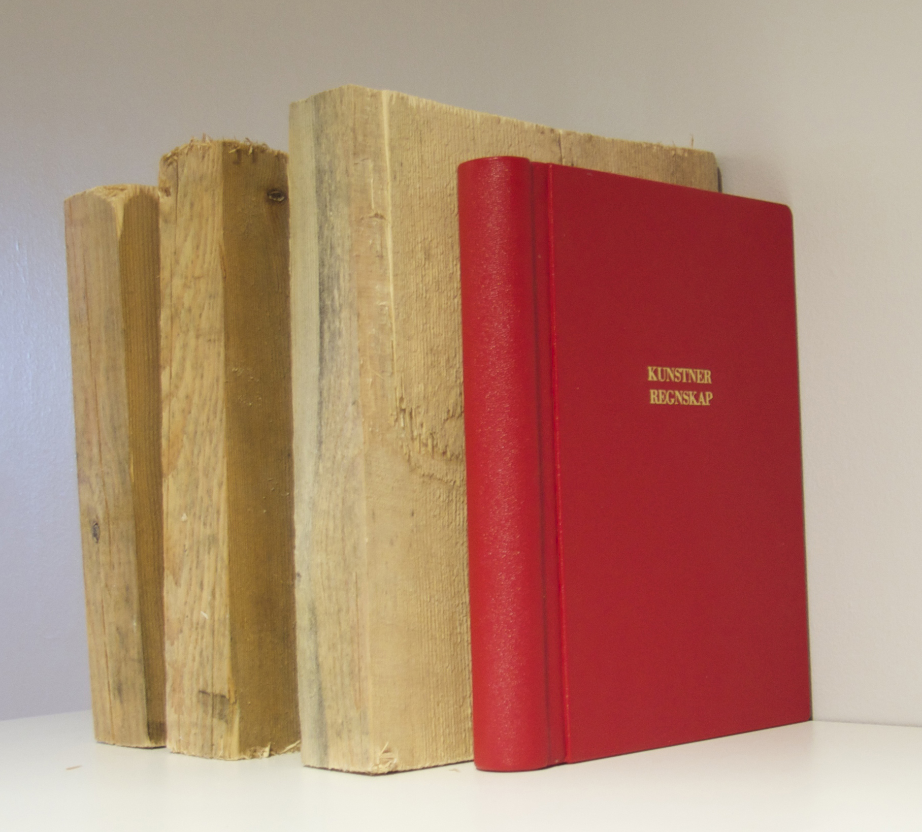 With this as a backdrop, the artist shows a fictional place. The starting point is a photograph from an actual work place in the paper industry from the 50’s. By showing photographs and untreated woodblocks in combination with tressel tables, lamps and ledgers, the work place setting raises questions about topics such as working hours and work morale. This project is part of a larger piece of research about work and the worker, in which the artist also draws on her own work situation as an artist. This presentation can be said to constitute the first part of the artist’s Skien’s Council artist’s residency of 2015.